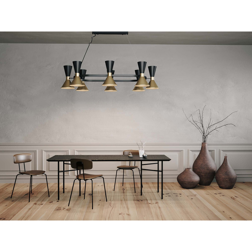 Люстра Dualight OV, арт. 25345 Завдяки неймовірній формі плафонів-клепсидр люстра Dualight OV — це подвійний удар світла по темряві. Дизайнерський задум зміг стильно поєднати гру геометрії та надати найбільшій версії люстри серії справді королівського масштабу. Об’ємні форми плафонів поєднані в овальній конструкції – це ідеальне рішення для освітлення великої їдальні чи вітальні, щоб підкреслити зону столу. Люстра українського виробництва створена в майстерні Pikart, піклуючись про кожну деталь, а особливо – про якість. Для виготовлення виробу використовують алюміній та латунь високої якості, а плафони покривають щільним матовим покриттям, щоб освітлення служило надійно та довго. У серії Dualight всі плафони містять два споти світла, що направлені вгору і вниз. У цій моделі Dualight OV загалом розміщені 16 спотів світла у два яруси. Для вашої зручності ви можете відключати один із ярусів, наприклад, нижній. Тоді верхні лампи м’яко заповнять простір розсіяним світлом, створюючи камерну атмосферу. Чудовий варіант для великих холів, ресторанів чи просторої вітальні в домі, де потрібно багато світла. Такий світильник вдало підійде як в інтер’єр у класичному стилі, так і підкреслить мінімалістичний інтер’єр м’яким теплом латуні. Як в інтер’єрі нижче, де люстра довершила стриманий мінімалістичний образ, моделюючи зону столу. Ви можете обрати як класичні варіанти дизайну, у поєднанні білого та чорного покриття з латунню, так і комбіновані поєднання з палітри трендових кольорів. Саме тому освітлення серії Dualight – чудовий варіант не лише для просторих холів чи вітальні в домі, а й ідеальний варіант для освітлення стильного ресторану чи кав’ярні. Доповнити образ ви можете за допомогою лаконічного підвісу, а також настінного бра Dualight. Для вашої зручності ми створили 3D моделі кожного виробу, щоб ви підібрали найкраще освітлення. За посиланням ви можете завантажити 3D модель люстри Dualight OV, арт. 25345 Ви можете замовити світильник онлайн з доставкою Новою Поштою по всій Україні. Або ж вибрати найкраще освітлення для простору, відвідавши наш шоурум світильників у Львові, де ми підберемо найкраще освітлення з думкою про вас та ваш інтер’єр. Завантажити 3D модель Люстри Dualight OV, арт. 25345