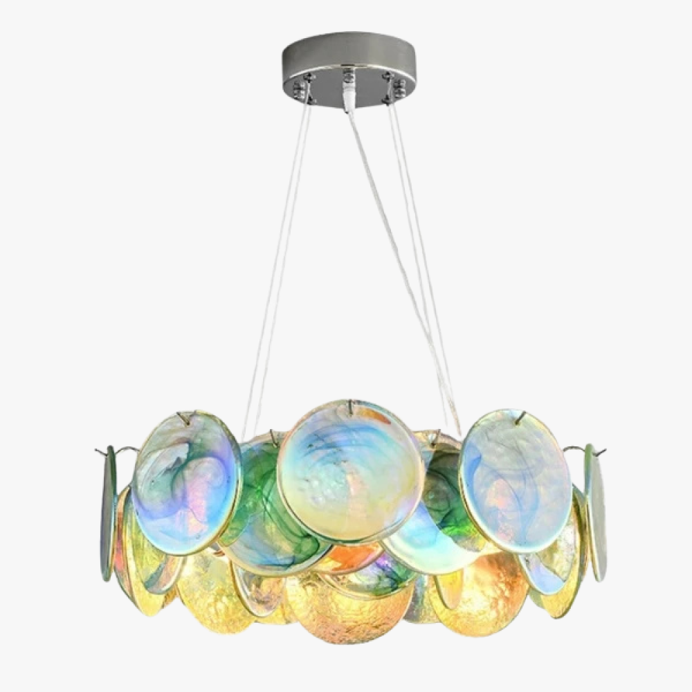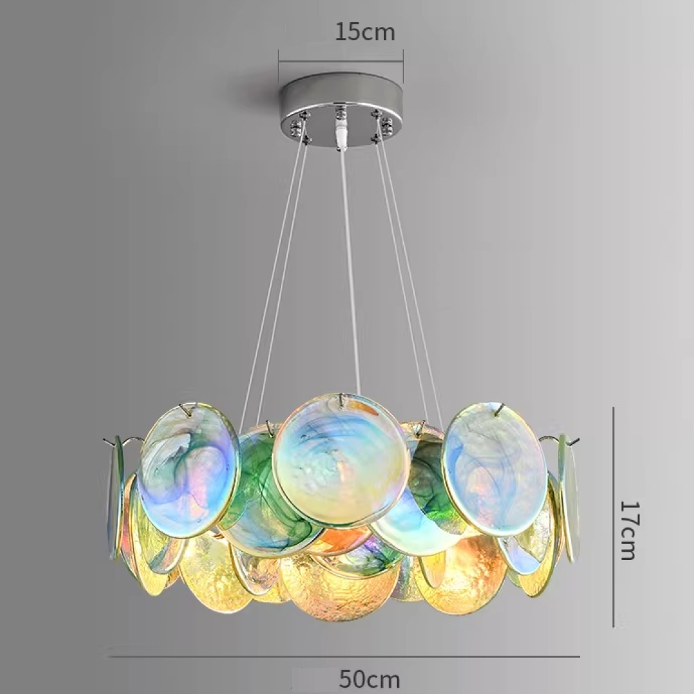 | Колір арматурисріблястий | Колір плафонів і підвісокпереливи блакитного, зеленого, жовтого, золотистого відтінків | Колірна температура3000К |