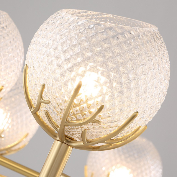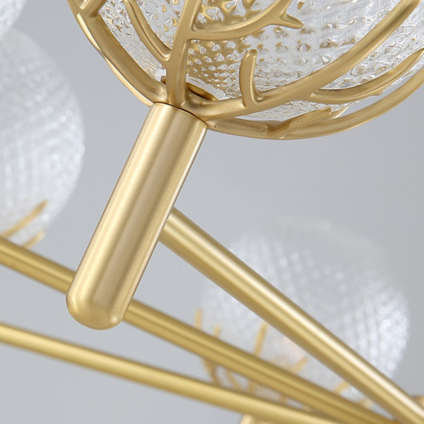 Эта люстра имеет 15 прозрачных плафонов из стекла, которые эффективно рассеивают свет, создавая очаровательную атмосферу. Латунная арматура придает ей элегантный и изысканный вид. Подходит для натяжных потолков и идеально подходит для гостиниц, ресторанов и других общественных мест.