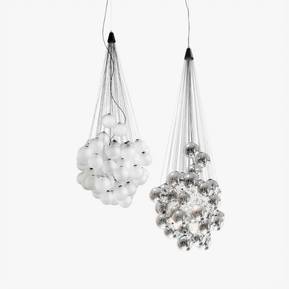 STOCASTICO - це стильна підвісна люстра, яка чудово поєднує в собі скло і метал. В наявності 48 плафонів і 72 плафона для вашого вибору. Розміри виробу можна побачити на фото в галереї. Люстра доступна в двох кольорових варіантах: бежевому і хромованому.