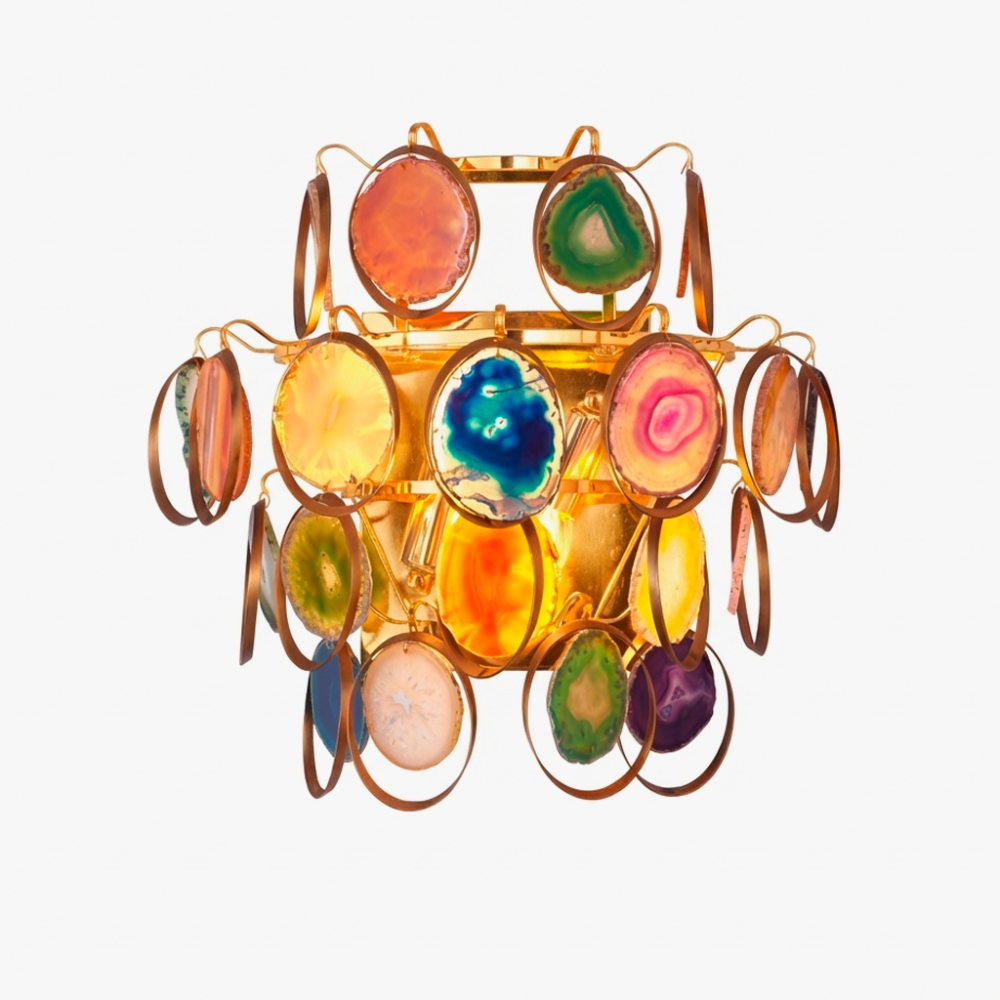 Арматура AGATE WALL Бра виконана в золотистому кольорі, що надає світильнику елегантність і розкіш. Плафони з каменю агату представлені в мультиколорі, додаючи світильнику яскравий і оригінальний акцент.