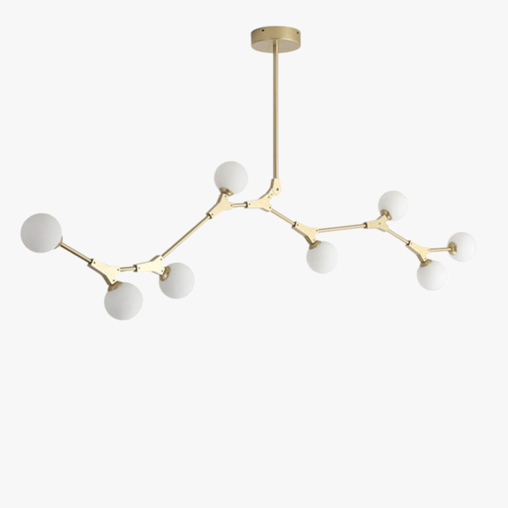 Дизайн люстри надихнутий молекулярною формою, з кулястими скляними плафонами, які кріпляться на латунному каркасі за допомогою регульованих шарнірних з'єднань. Це створює красиву рівновагу асиметрії і ідеальних сфер, роблячи люстру виразним стилістичним акцентом у вашому інтер'єрі.