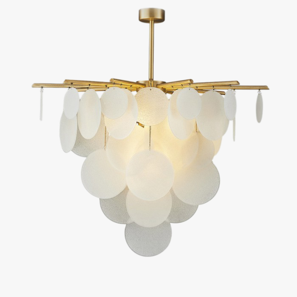 Унікальні скляні пластини матового кольору на латунному каркасі роблять цю люстру по-справжньому унікальною. Її тепле світло проникає крізь пластини, створюючи враження справжнього льоду і полум'я. Це надає особливий шарм і затишок будь-якому приміщенню.