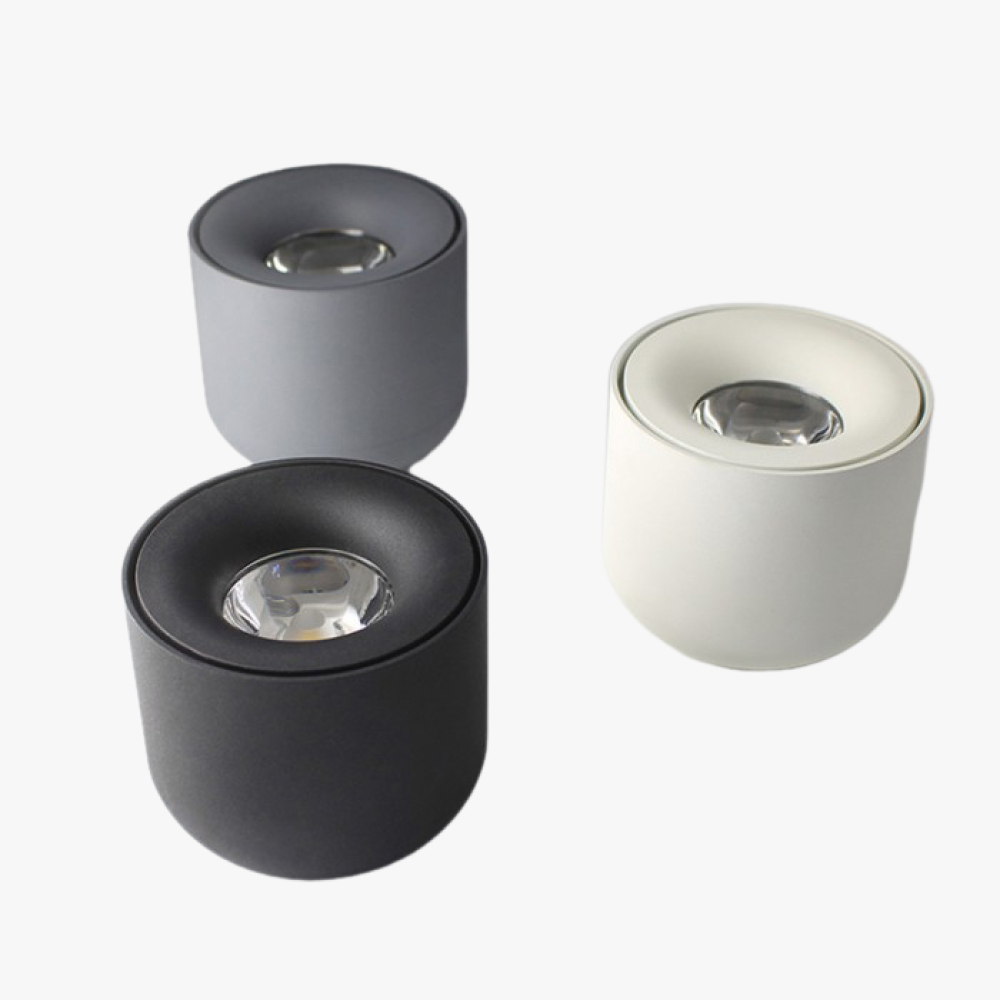 Спотовий накладний світильник у мінімалістичному дизайні. Корпус світильника має матову поверхню і доступний у чорному, білому, сірому і прозорому кольорах. Світильник оснащений вбудованим світлодіодом з оптичним лінзуванням. Потужність світильника може бути вибрана: 5 або 7 ватт з теплим відтінком або природним білим світлом. У комплекті йдуть лампи LED.