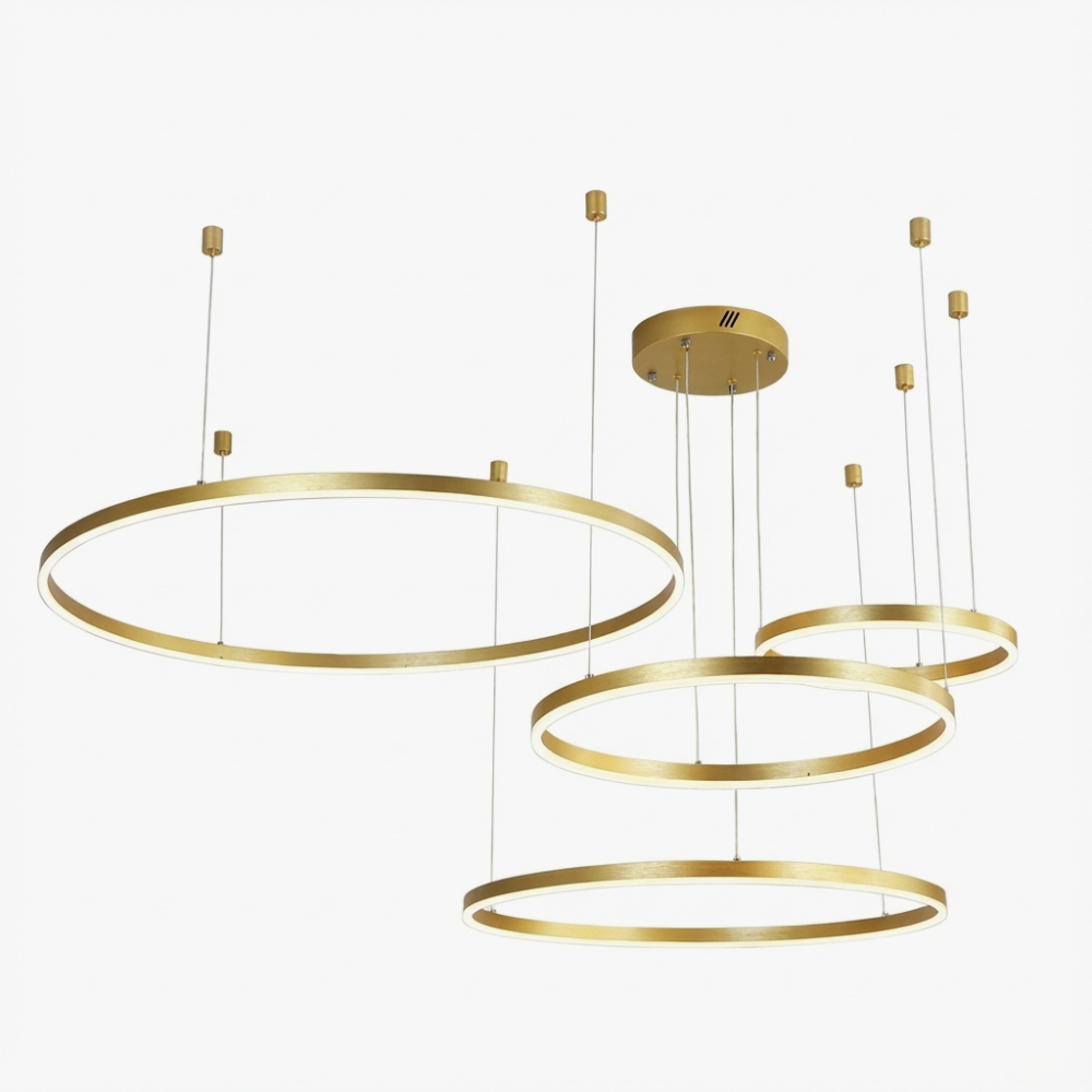 Підвісний світильник Ringooo - це кільцева люстра з елегантним дизайном, яка стане яскравим акцентом в будь-якому інтер'єрі. Вона доступна в золотому кольорі, який надасть кімнаті вишуканість і розкіш.