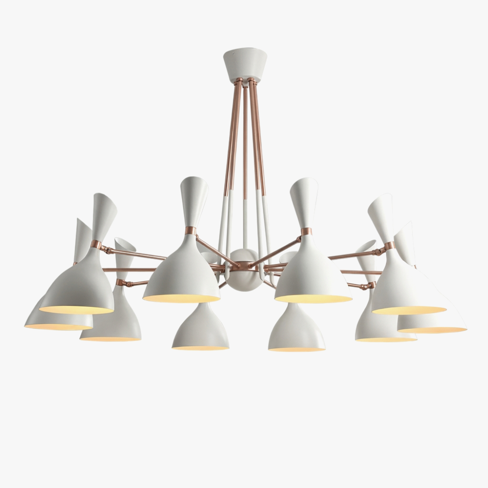 TRUMPET Дизайнерська люстра - елегантне поєднання строгості променевої конструкції і м'яких ліній плафонів. Виготовлена з міцного металу, що забезпечує надійність і тривалий термін служби.